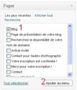 Enfin, toujours au même endroit vous cocherez votre page « Blog » que vous ajouterez directement à votre menu.